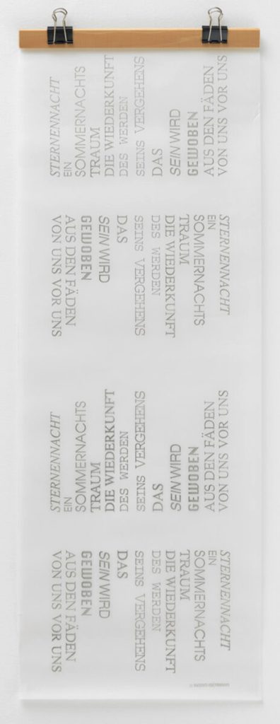 Isermann takes words, letters, and punctuation out of their semantic context and turns their phonetic, visual, and acoustic dimensions into literary tools. Language no longer describes a fact, a thought, or a mood; it represents only itself. For this, she also relies on visual design. Isermann’s artistic practice puts her in the tradition of Eugen Gomringer, who coined the term “Konkrete Poesie” [Concrete Poetry] in the 1950s in analogy to the term “Concrete Art.” The core poetic act is thus the construction or the innovative arrangement of the individual language elements. Gomringer regards his poems, which he calls “constellations,” as the simplest possible way to create visual poetry. Through the text’s graphic arrangement, its content is thus underlined or questioned in an ironic way.