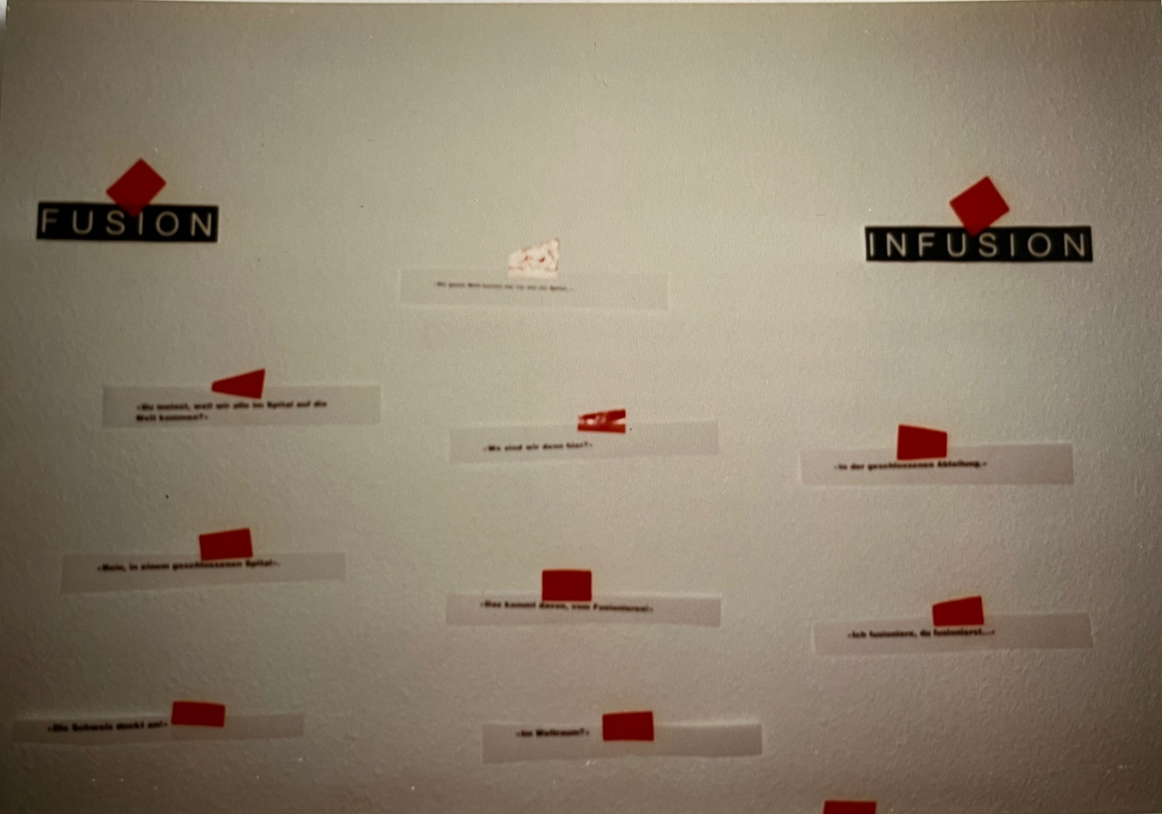 GSBK Zürich, Gruppenausstellung Rotkreuzspital, 1997. Installation Fusionen-Infusionen mit Theater-Performance Schauspiel-Akademie.
